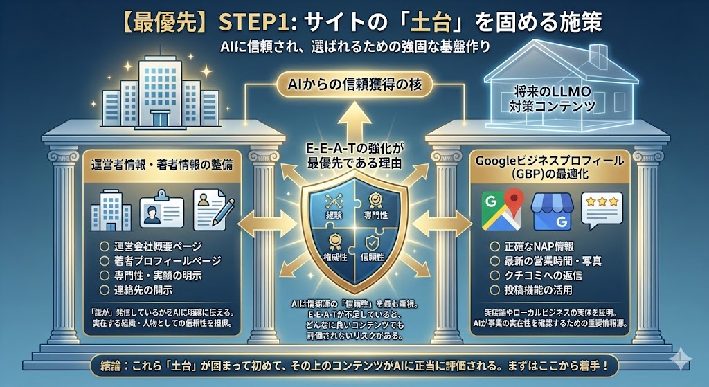 LLMO対策において最も重要なのは、E-E-A-T(経験・専門性・権威性・信頼性)の強化と、運営者情報の整備という「土台固め」です。生成AIから信頼できる情報源として認識されることが、すべての施策の前提となります。
