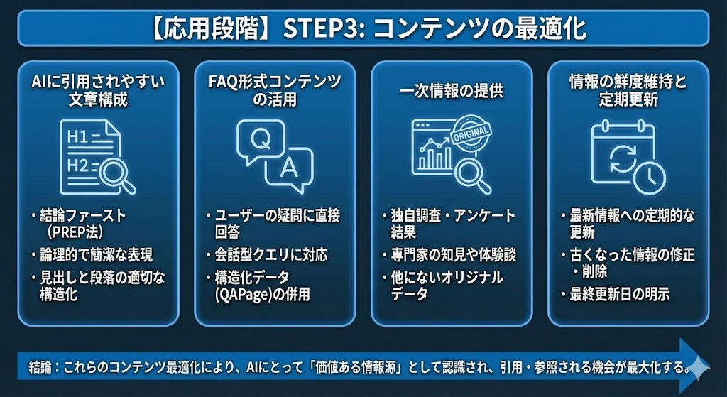 土台となるE-E-A-Tと技術的基盤が整ったら、次はコンテンツそのものの最適化に取り組みます。生成AIに引用されやすいコンテンツには、いくつかの共通した特徴があります。