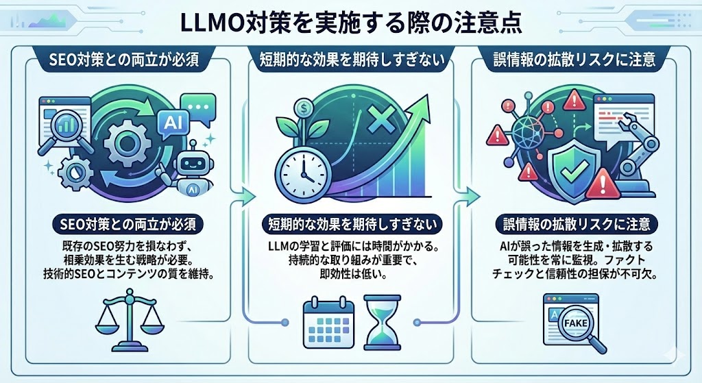 LLMO対策に取り組む際には、いくつかの注意点を押さえておく必要があります。過度な期待や誤った認識は、かえって逆効果を生むこともあります。