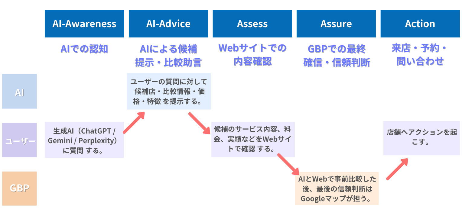 このモデルの特徴は、購買行動の起点が「AI検索」になっている点です。AIに認知され、おすすめされる状態を作ることが、これからの集客において重要な鍵となります。