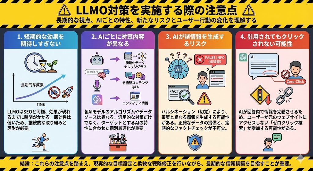 LLMO対策に取り組む際には、いくつかの注意点を頭に入れておく必要があります。過度な期待を避け、現実的なアプローチで進めることが成功への鍵です。