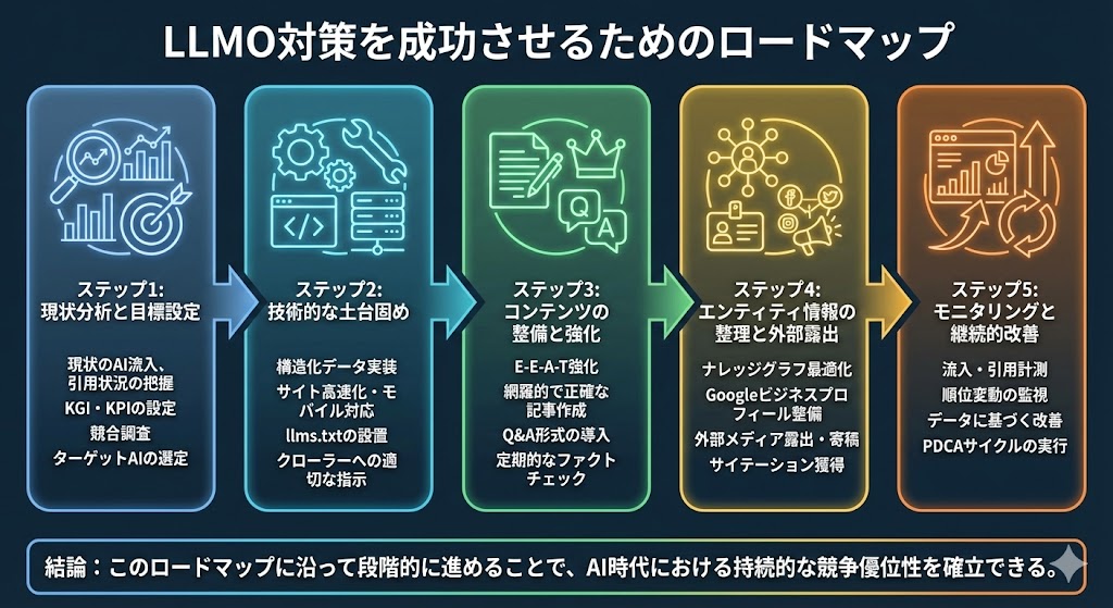 ここまでの内容を踏まえて、LLMO対策を進めるためのロードマップを整理します。自社の状況に応じて、適切なステップから着手してください。