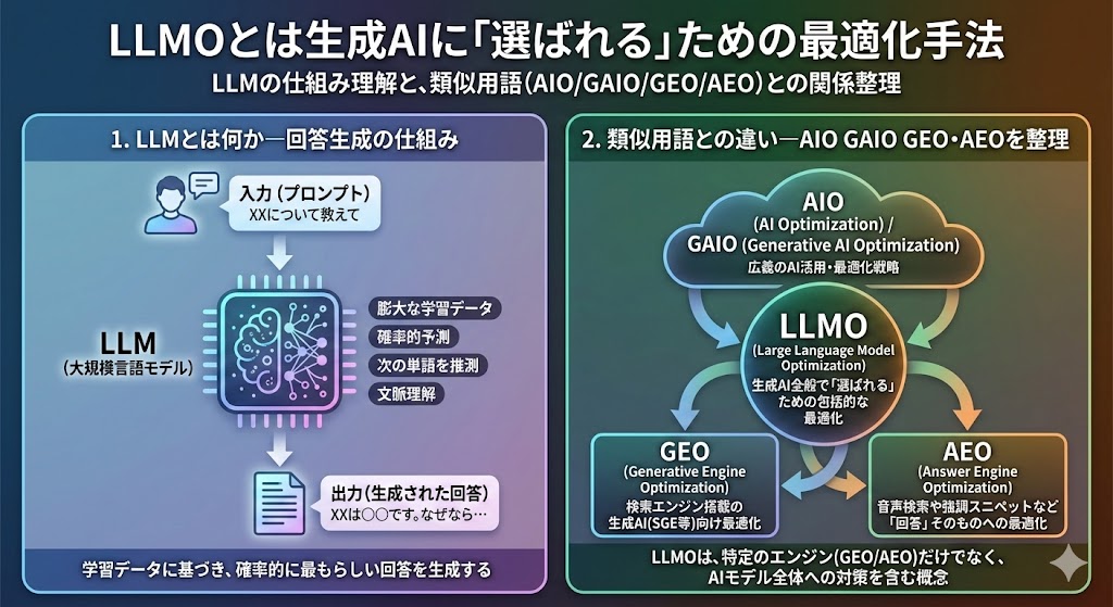 | LLMO | Large Language Model Optimization | ChatGPT、Claude、Geminiなど対話型AI全般 |