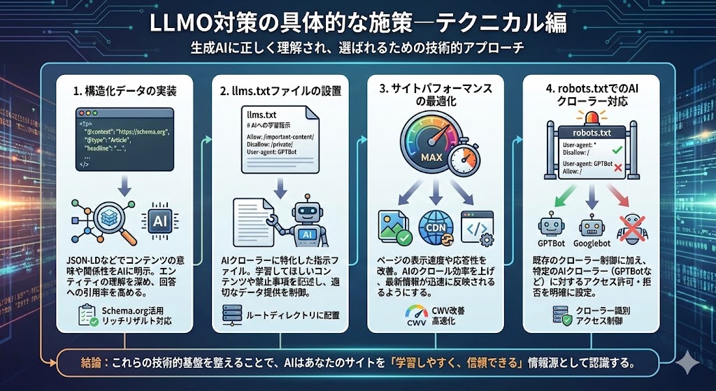 ここからは、LLMO対策の具体的な施策を解説していきます。まずはサイトの技術的な基盤を整えるテクニカル施策から見ていきましょう。