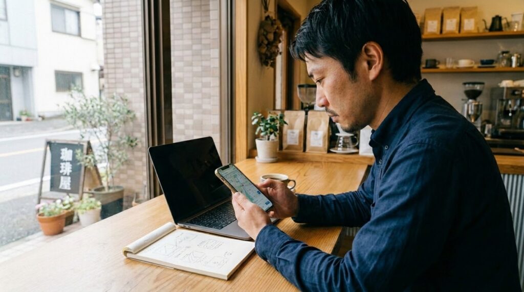 距離は、検索しているユーザーの位置情報と店舗の所在地との物理的な距離を指します。「近くのカフェ」のように地域名を含まない検索では、ユーザーのGPS情報が直接影響し、現在地に近い店舗ほど優先的に表示されます。
