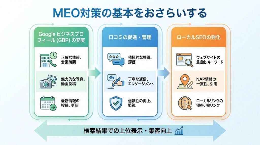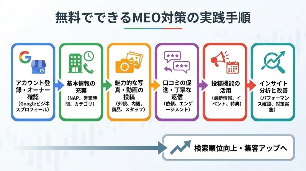 無料のMEO対策は「登録して終わり」ではなく、継続的な運用がカギを握ります。以下の手順に沿って取り組むことで、費用をかけずにGoogleマップでの露出を高められるでしょう。