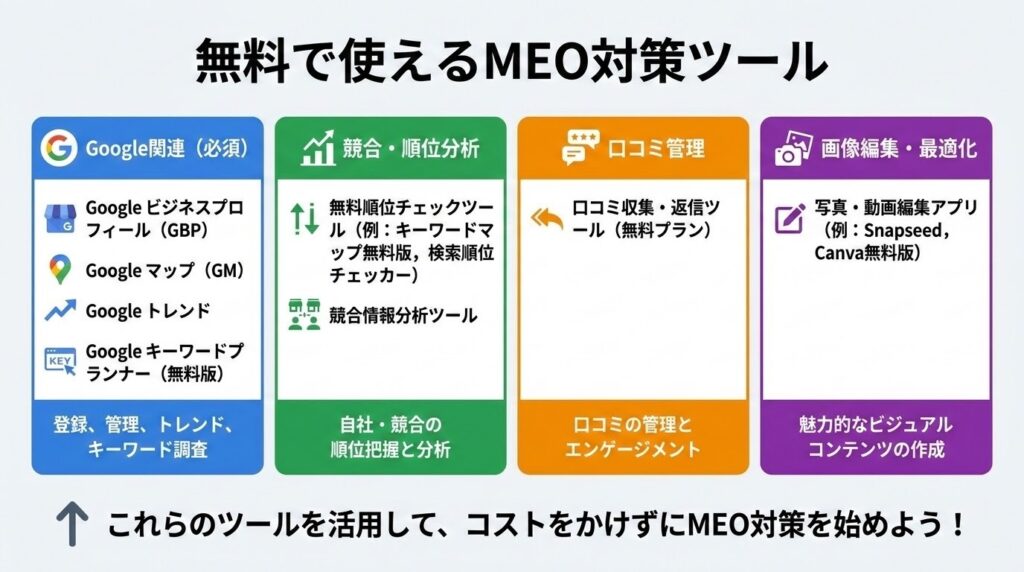 ここからは、費用をかけずにMEO対策を支援してくれるツールを紹介します。いずれもGoogleが提供する公式ツールか、業界で広く利用されている定番ツールです。