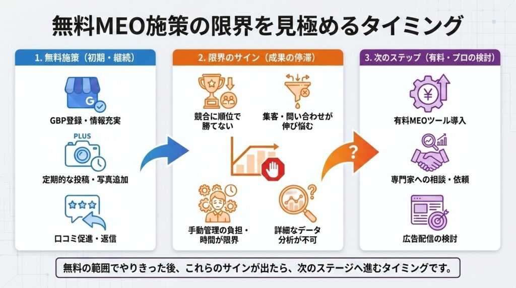 無料のMEO対策で着実に成果を積み上げられるのは事実ですが、ビジネスの成長に伴い、無料施策だけでは対応しきれなくなるタイミングが訪れるのも現実です。