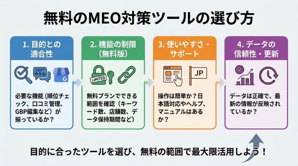 無料ツールと一口に言っても、提供元の信頼性や機能の範囲はさまざまです。導入前に確認しておきたいポイントを整理します。