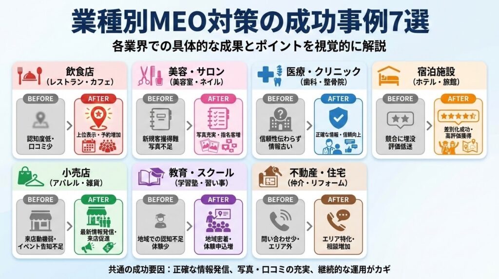 MEO対策の効果は業種やエリアによって異なります。ここでは、公開されている具体的な実績データをもとに、7つの業種の成功事例を紹介します。