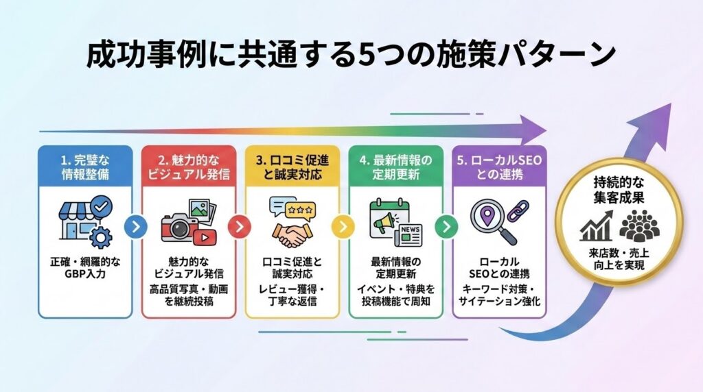 業種は異なっても、MEOで成果を出している店舗には共通する取り組みが見られます。ここでは施策パターンを5つに整理しました。