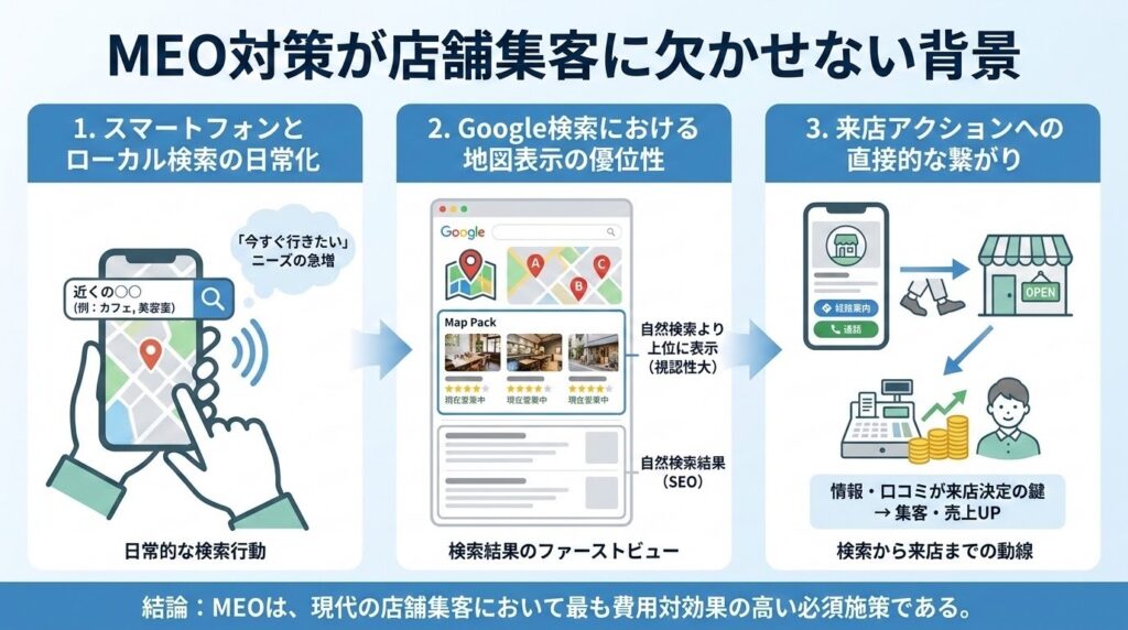 では、なぜ今MEO対策がここまで重視されるのでしょうか。その理由はユーザーの検索行動の変化にあります。