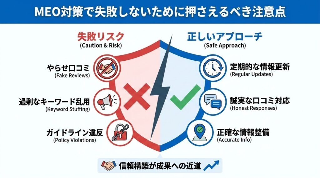 MEO対策は正しく行えば高い効果が期待できる一方、やり方を誤るとGoogleからのペナルティを受けるリスクも伴います。失敗を避けるために押さえておきたいポイントを3つ紹介しましょう。